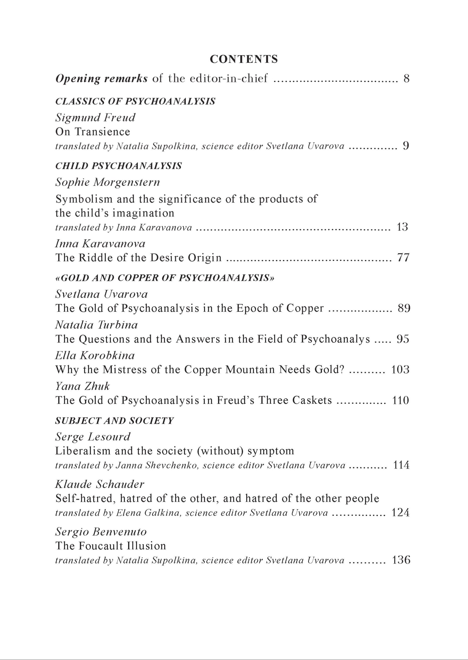 З класичних праць у цьому номері Ви знайдете поетичну статтю Зигмунда Фрейда «Швидкоплинність» (публікується російською мовою вперше) і уривок з книги Софі Моргенштерн «Дитячий психоаналіз». Книга готується до видання і найближчим часом буде представлена читачам, які цікавляться дитячим психоаналізом і розвитком дитини взагалі. Книга стане цінним джерелом теорії і практики дитячого психоаналізу. Софі Моргенштерн є родоначальником абсолютно нової техніки роботи з дітьми – проектування несвідомого образу тіла в малюнку, який слідує або передує мовленню дитини. С. Моргенштерн намагалася знайти відповіді на багато питань щодо формування структури особистості дитини і дорослої людини, зробила великий внесок у вивчення психоаналітичної характерології, звернулася і найбільш глибоко описала тему символізму продуктів уяви дитини, виражених в казках, іграх, фантазіях, сновидіннях і, особливо, в малюнках. У розділі «Дитячий психоаналіз» Ви також зможете ознайомитися зі статтею Інни Караванової «Загадка походження бажання». Цей матеріал був представлений на II Літній Школі Української Асоціації Психоаналізу. Ще чотири авторські матеріали, вперше представлені на цій же Літній школі, яка відбулася у вересні 2013 року, об’єднані в рубриці «Золото і мідь психоаналізу».