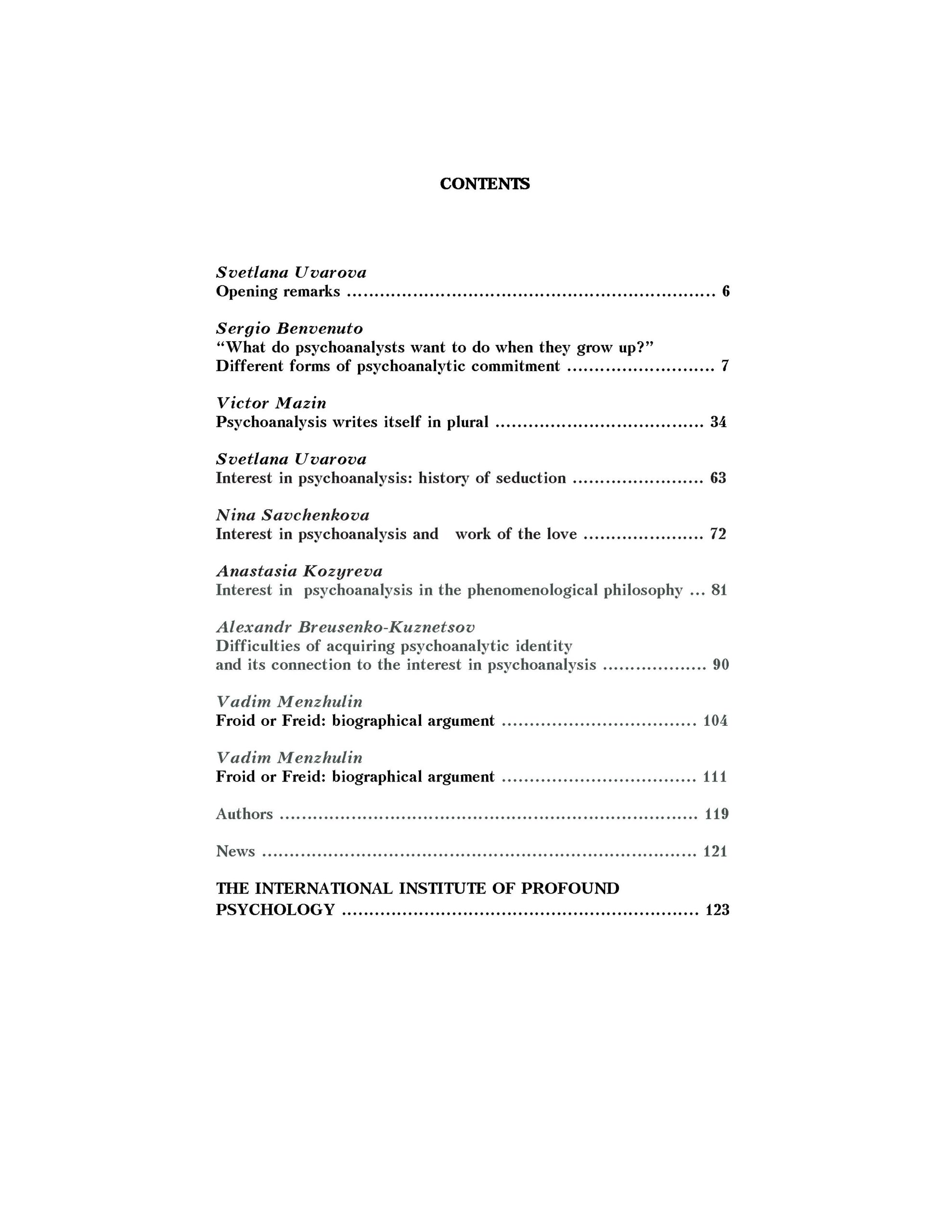 Особливість цього номера полягає і в тому, що в ньому зібрані роботи не тільки психоаналітиків, але й фахівців інших галузей знань: філософії, феноменології, літератури і мистецтва, академічної психології та психіатрії. Це, в свою чергу, є ілюстрацією інтересу до психоаналізу і демонструє, наскільки сьогодні ідеї Фрейда є предметом жвавої дискусії в багатьох галузях знань.